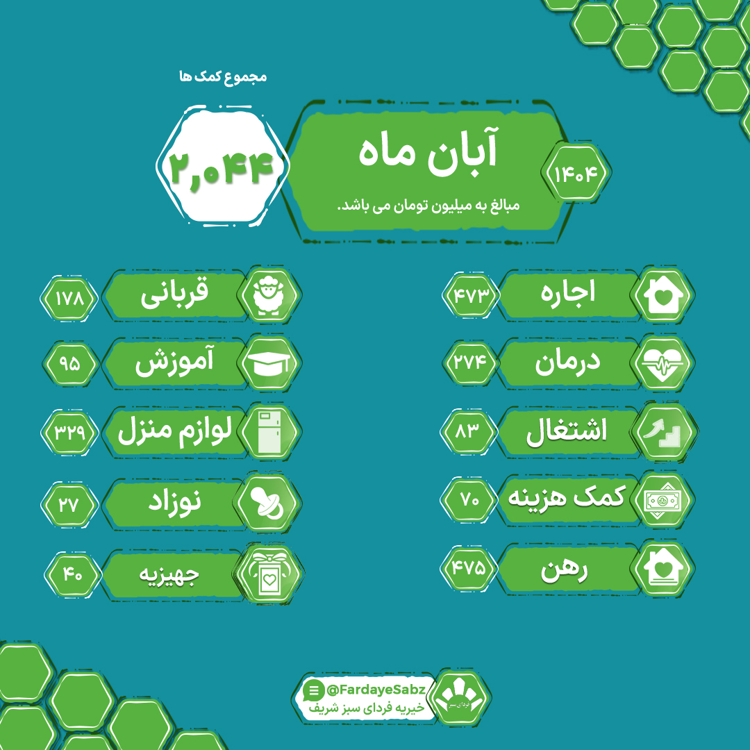 به لطف خداوند متعال و همراهی دلگرمکننده شما خیرین ارجمند، در آبان ماه امسال، موفق شدیم مبلغی بالغ بر ۲ میلیارد تومان را صرف رفع مهمترین نیازهای خانوادههای تحت پوشش کنیم. این کمکها، مستقیماً به سمت تقویت زیرساختهای زندگی و ایجاد ثبات در این خانوادهها هدایت شد.