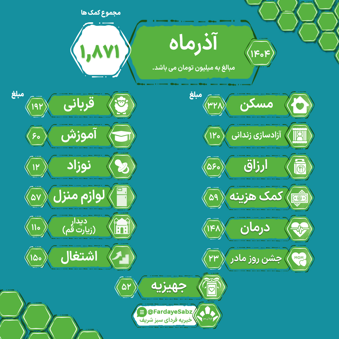 در آذرماهی که گذشت، به پشتوانه اعتماد و دستهای سخاوتمند شما خیرین گرانقدر، توانستیم مبلغ 1.871 میلیارد تومان را برای گرهگشایی از زندگی خانوادههای تحت پوشش هزینه کنیم. هدف ما در این ماه، فراتر از کمک مالی، ایجاد ثبات و تزریق امید به خانههایی بود که در سختی بودند.