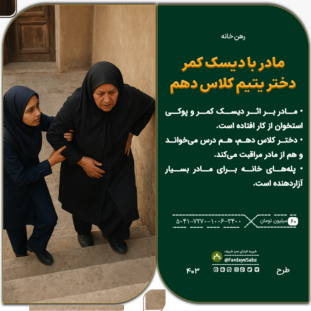 «۹ سال پیش بود که پدرم بر اثر سکته قلبی ما را ترک کرد. حالا مادرم مانده و دیسک کمری که هر روز بدتر میشود. پزشک گفته بهدلیل پوکی استخوان، حتی نباید زمین بخورد. وقتی از مدرسه برمیگردم، همه کارهای خانه را خودم انجام میدهم...»