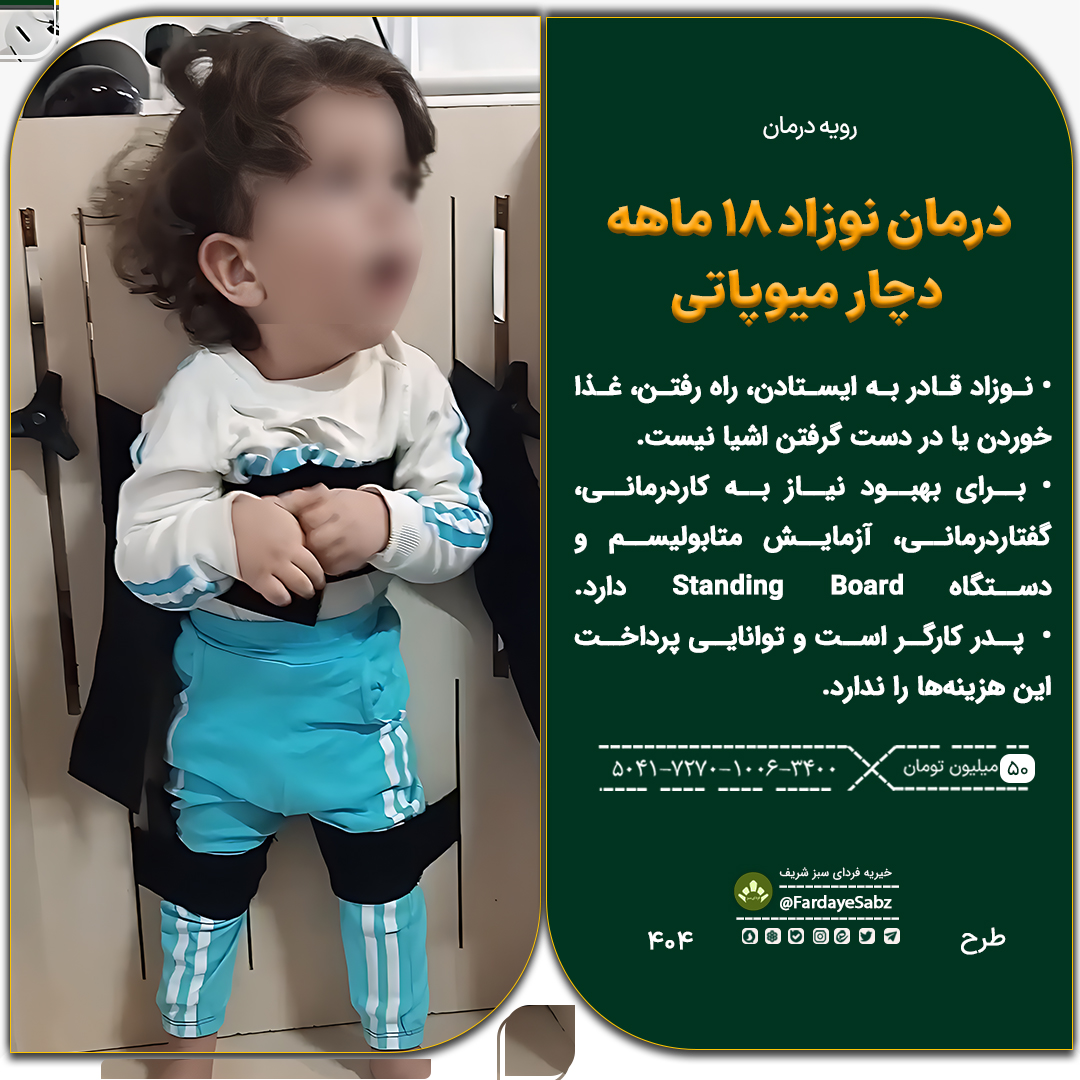 هیچگاه فکر نمیکردم جگرگوشهام، فرزندی که بیش از هشت سال آرزویش را داشتم، دچار چنین مشکلی باشد.نوزاد ۱۸ ماههام بهدلیل بیماری میوپاتی قادر به ایستادن، چهاردستوپا رفتن، راه رفتن، غذا خوردن یا در دست گرفتن اشیا نیست.