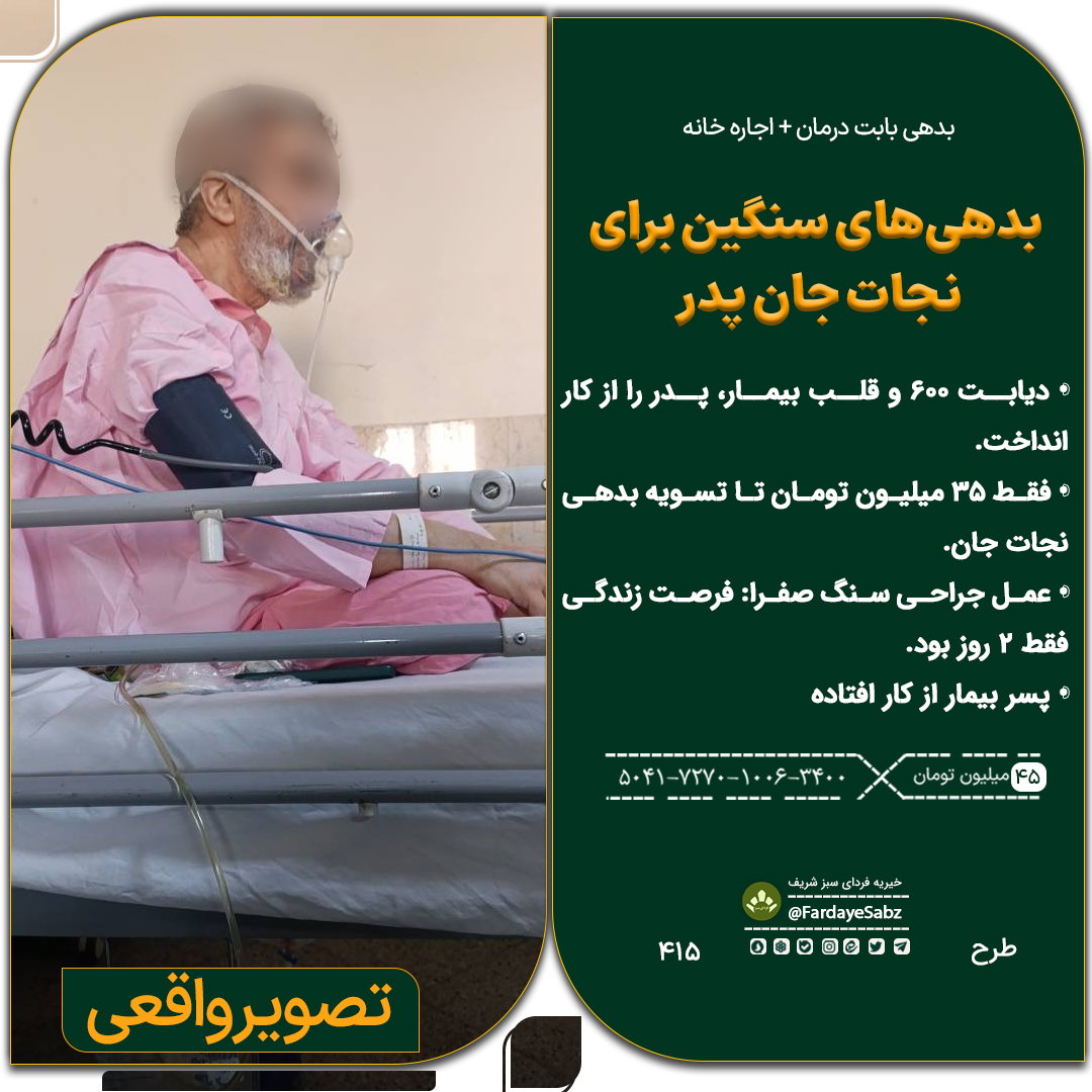 "پدرم به دلیل بیماری قلب و دیابت تا پیش از این نیز از کار افتاده بود. سه ماه پیش، رگهای قلب پدرم گرفت و در بیمارستان شهید رجایی عمل قلب باز انجام داد."