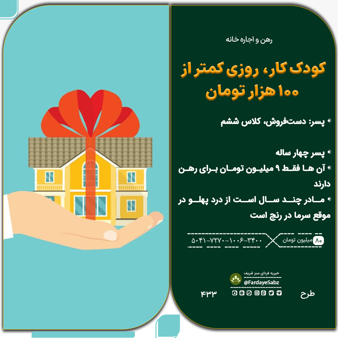 با تامین رهن خانه، امید را مهمان خانه مادر و دو کودکش کنیم.