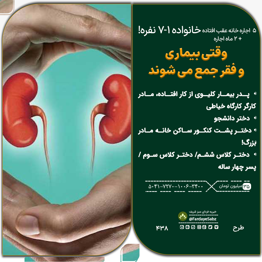 قبلا کارگری می کردم و زندگیمان می چرخید اما چندین ماه است که از شدت بیماری کلیه، زمینگیر شده ام و حتی کرایه خانه را نمیتوانم پرداخت کنم. کار به جایی رسیده که همسرم مجبور به کارگری در یک خیاطی شده است.