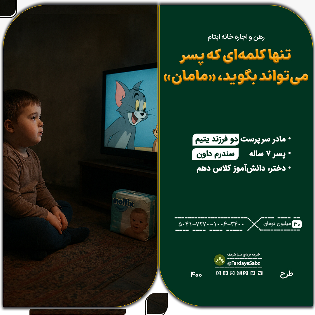 «دوم آذر سه سال از فوت همسرم بر اثر ایست قلبی میگذرد. حالا من ماندهام با دو فرزند یتیم؛ پسری که مبتلا به اوتیسم است. قبلاً خیلی بیتابی میکرد، اما از وقتی خیریه برایمان تلویزیون خریده، هر وقت برنامه کودک میبیند آرام میشود؛ وگرنه خیلی عصبی میشود.»