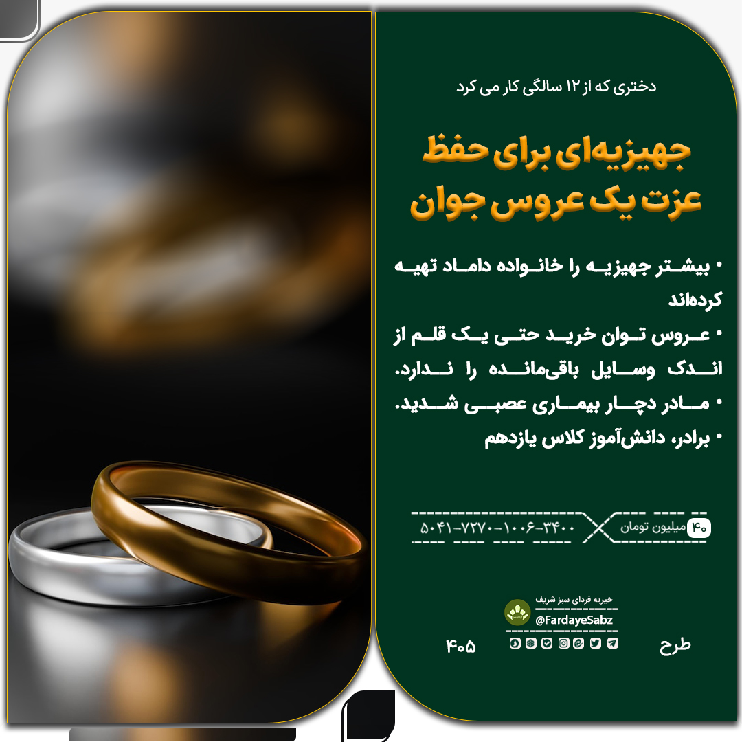 از دوازدهسالگی کار کردم تا خرج مادر بیمار و برادر کوچکم را بدهم.اکنون که عقد کردهام، خانوادهی داماد بیشتر وسایل جهیزیه را خریدهاند، اما چند قلم ضروری مانند جاروبرقی و ظروف مانده که حدود ۴۰ میلیون تومان هزینه دارد،در حالی که حتی یک میلیون تومان هم نداریم و نمیخواهم در برابر خانوادهی داماد، شرمنده شوم.