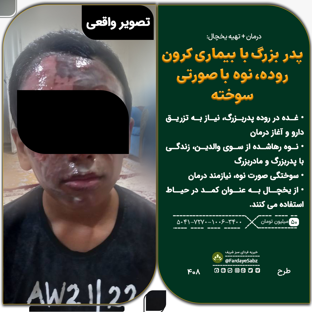 پدر و مادرم بعد از تولدم رهایم کردند. حالا با پدربزرگ و مادربزرگ پیر و بیمارم زندگی میکنم. در بازی در کوچه صورتم سوخت و نیاز به درمان دارم.پدربزرگم به بیماری کرون روده مبتلاست و تودهای در روده او وجود دارد.