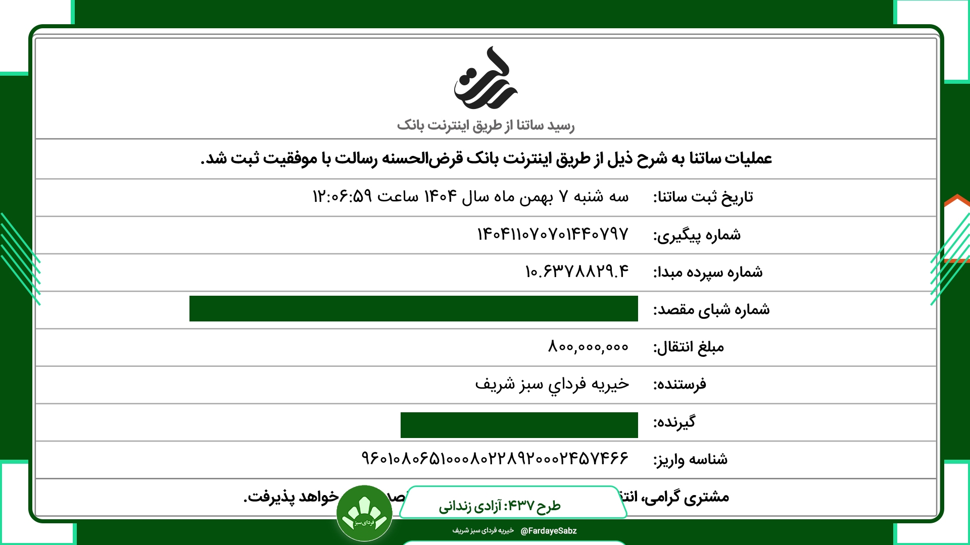گزارش: به لطف خداوند و همراهی شما خیرین گرامی، پدر این خانواده آزاد شد و امید دوباره به خانهشان بازگشت. رسید واریز مبلغ ۸۰ میلیون تومان در ادامه برای شفافیت و اطلاع شما عزیزان قابل مشاهده است.