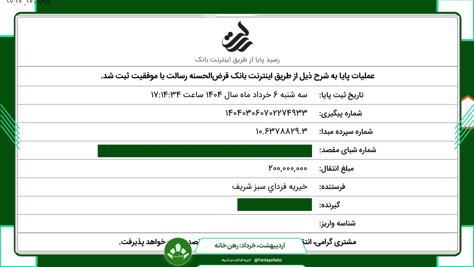 گزارش: برای این پروژه مبلغ 20 میلیون تومان هزینه شد. فیش بانکی مربوطه را میتوانید در ادامه گزارش مشاهده نمایید.